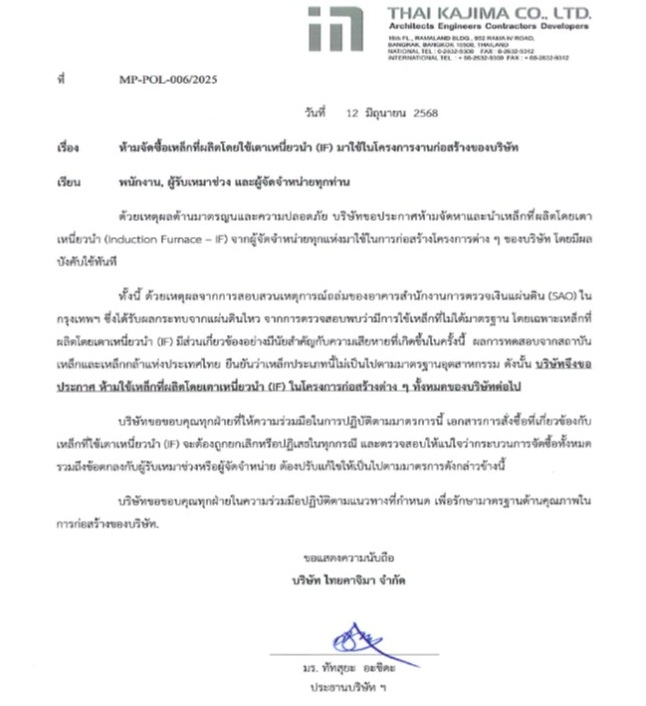 หลังจากการพิจารณาอย่างรอบคอบและการประเมินภายในอย่างครอบคลุม บริษัทได้ตัดสินใจยุติการจัดซื้อเหล็กที่ผลิตด้วยวิธีเตาหลอมเหนี่ยวนำ (IF) จากซัพพลายเออร์ทุกราย การตัดสินใจนี้อ้างอิงจากผลการทดสอบของสถาบันเหล็กและเหล็กกล้าแห่งประเทศไทย และเกี่ยวข้องอย่างมีนัยสำคัญกับความเสียหายของโครงสร้างอาคารในกรุงเทพฯ ที่เกิดจากเหตุแผ่นดินไหว